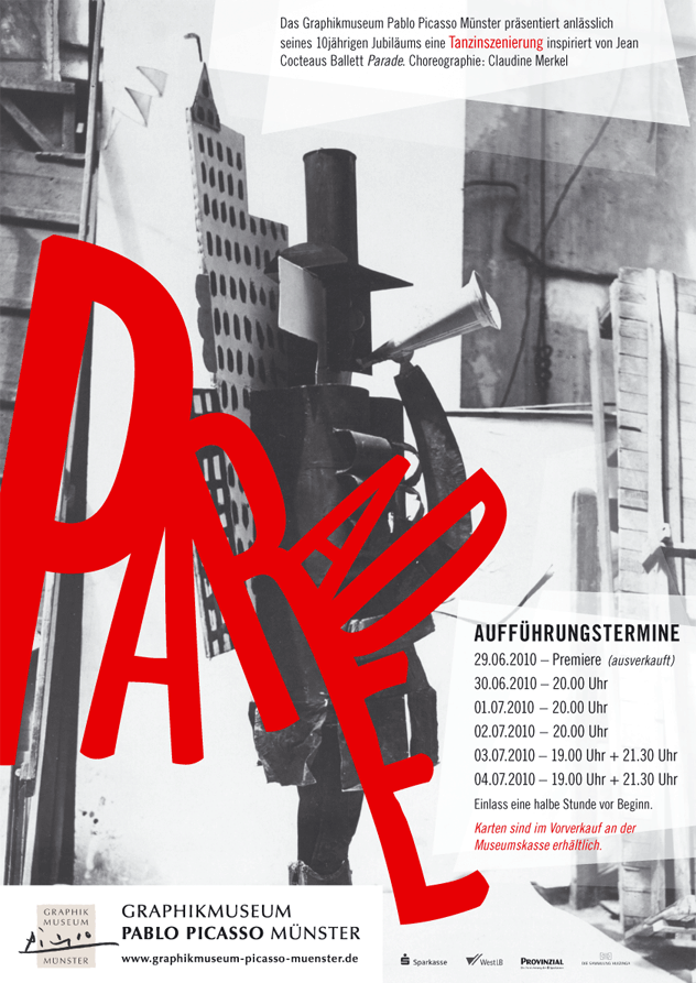 Unter Begleitung der Münsteraner Oboistin Stefanie Bloch wird PARADE von den Solisten Marianne Simon (Paris), Xinyun Lu (Nationale Oper Peking) und Armin Biermann (Neuer Tanz, Düsseldorf) getanzt. Die Kostüme wurden eigens von dem Pariser Designer Jean Malo entworfen und die Musik von dem Münsteraner Komponisten Burkhard Fincke geschrieben.